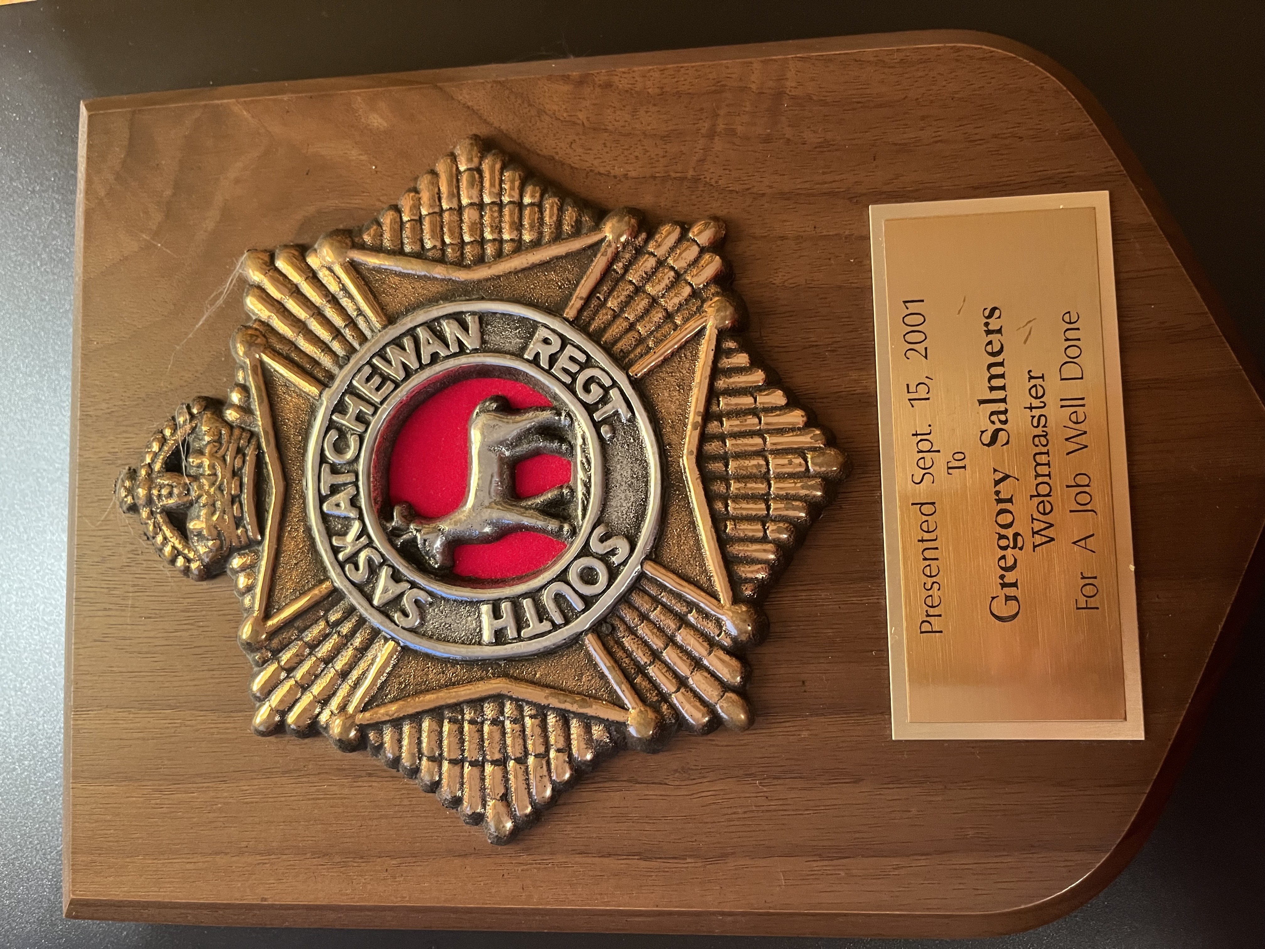 A life membership in the South Saskatchewan Regiment Association and plaque was granted to Greg Salmers by the Association on 15Sep2001 in recognition of his previous and ongoing work with SSR veterans and their families to create and sustain this website. While not a veteran of the South Saskatchewan Regiment, Greg Salmers is a veteran of a sister regiment, the Saskatchewan Dragoons. As time passed, Cec Law wrote in a letter of 17Dec2009, that Mr. Salmers is "now the closest thing to an SSR veteran that we have...you know as much as anyone now, about the SSR history." In 2022, the Lieutenant Governor of the Province of Saskatchewan conferred upon Mr. Salmers the Queen Elizabeth II Platinum Jubilee Medal in recognition of his efforts such as this web site and its educational value.