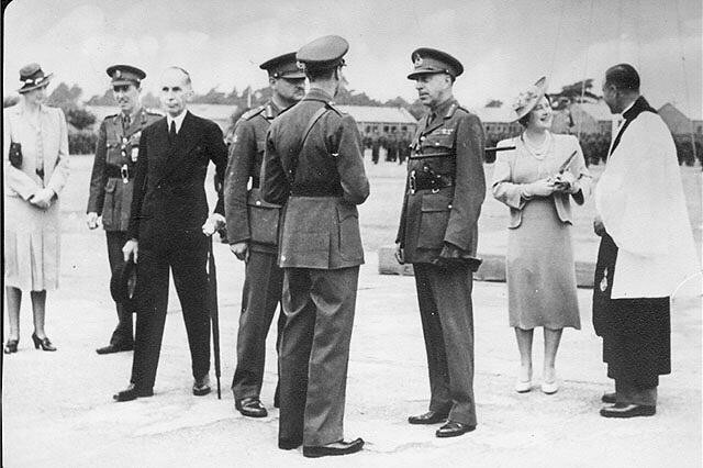 From left to right: Lady-in Waiting, King's Equerry,Hon. Vincent Massey, Major General Burns, King George VI (back to camera), Lt. General Crearar, Queen Elizabeth, Hon. Captain Rev. Rupert Leslie Taylor. Leslie Taylor became Dean of St. Alban's Cathedral Church in Prince Albert, acting in that capacity from the early 50.s until his retirement about 1963. He died in Winnipeg in 1979.