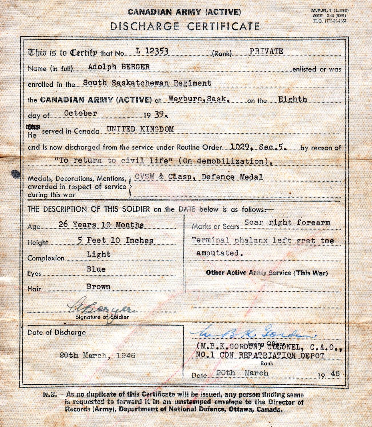 My father, Adolph Berger served in the South Saskatchewan Regiment during WWII. He joined the Regiment in Weyburn, Sask on the 8th October 1939, Service No. L-12353 and was discharged here in England on the 20th March 1946.