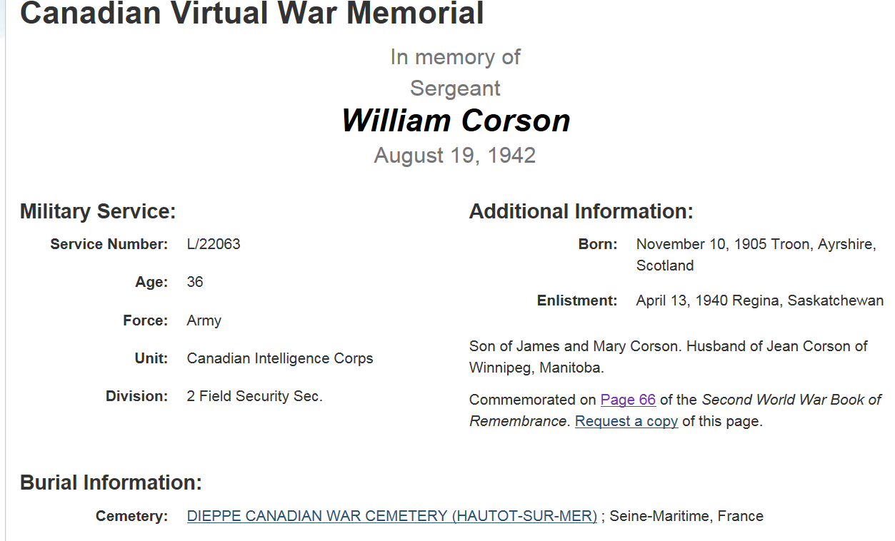 The soldier I am studying was named William Corson who was born in Scotland and moved to Saskatchewan and joined the South Saskatchewan Regiment in 1939. He was intelligence for WW2 and was apart of the Dieppe raid on August 19, 1942 and sadly died in the battle.