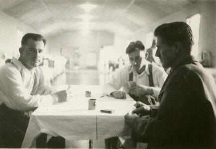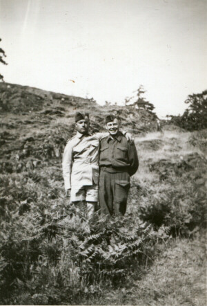 Peter Dan Heidrick saluting in front, 2 others unknown. Date on the back of the photo 16 Mar 1942.