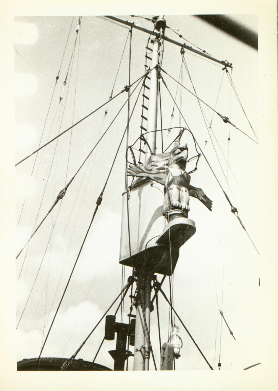 This Thunderbird totem pole was always mounted on the mast when the Quesnel sailed. If anyone knows the history of this totem pole, contact bev.lundahl@accesscomm.ca