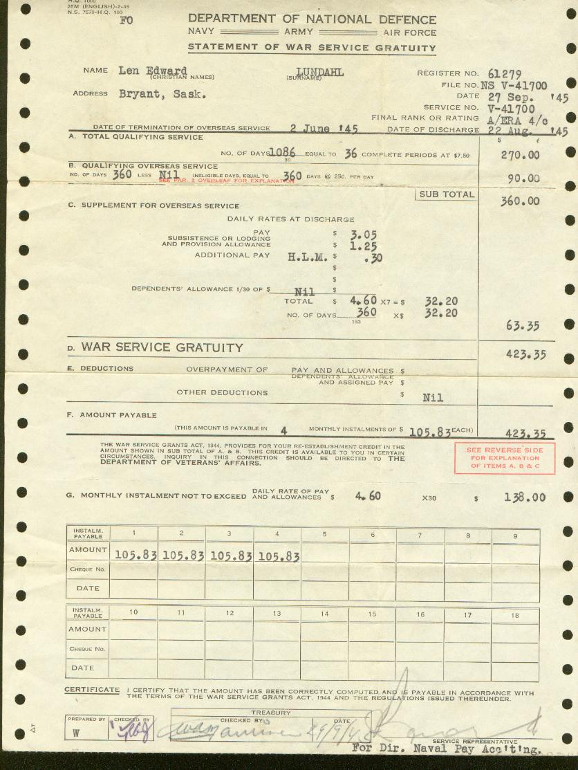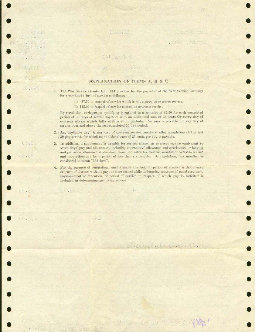 Statement of War Service Gratuity - back side