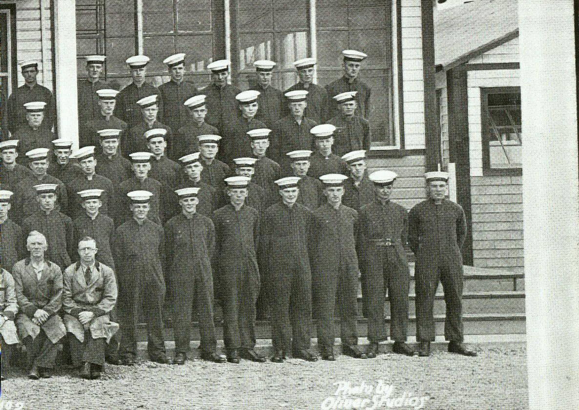 The crew of the Quesnel. Notice totem pole. Back row, far right, Bill Simmington, Chief ERA(Engine Room Artificer). Front row, far left, Len Lundah ERA, Fourth Class.