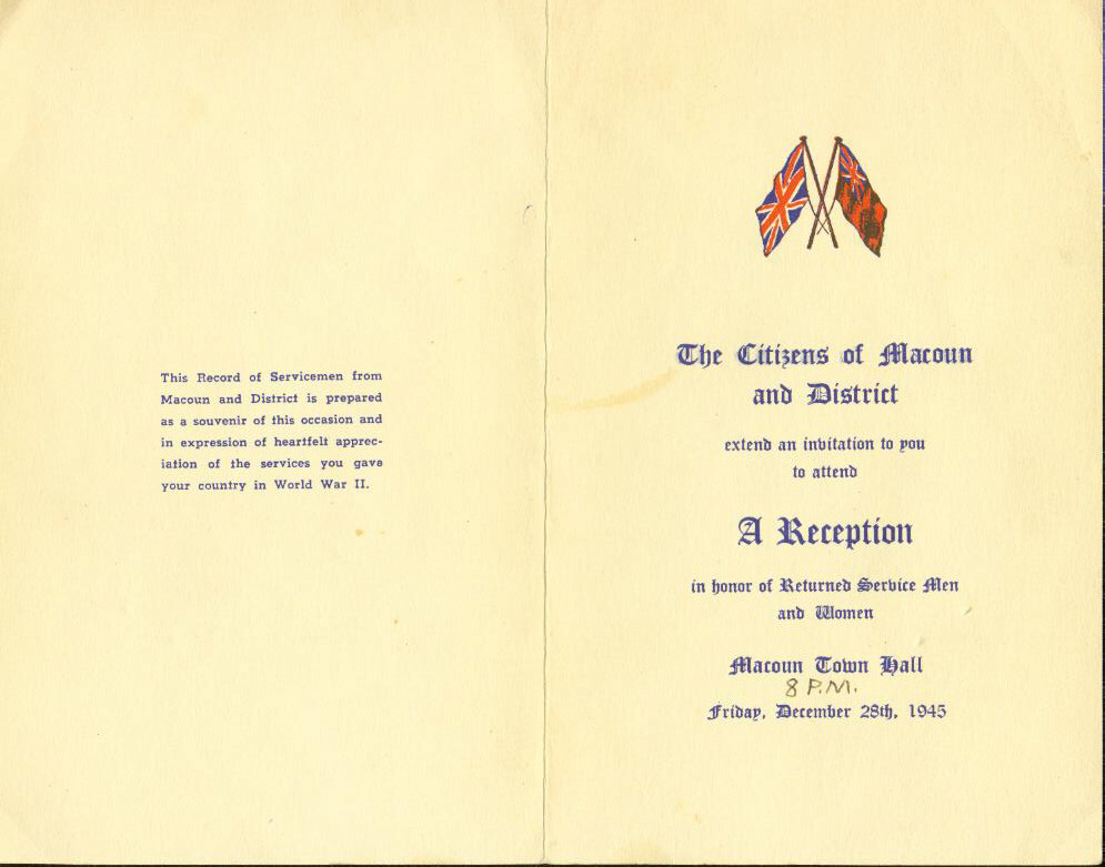 Returned Service Men and Women - Reception - Macoun, Friday, December 28th, 1945 - front and back covers