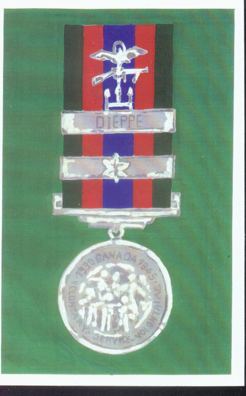 A painting by David Devigne of Pessac/Bordeaux, France, of Canadian ribbon and Medal CVSM (Canadian Volunteer Service Medal) & Clasp - the clasp is a silver bar with small maple leaf, placed across the Ribbon, Dieppe clasp above.