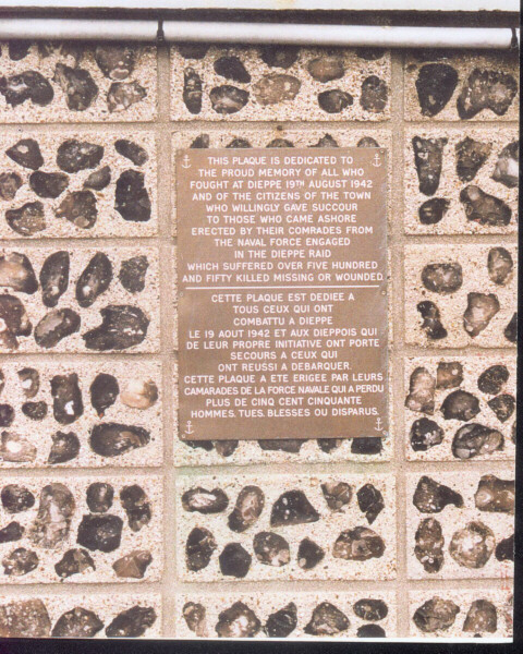 The first Dieppe Memorial placed there by Prime Minister MacKenzie King on 18 August 1946. It is located near west end of White Beach in vicinity of the Casino. The RHLI & Essex Scottish suffered many casualties when attempting to take the Casino (see map, above). Described as "round white ball with Red Maple Leaf in center" with 'Canada' below, and a brass plate inscribed with date of presentation. MacKenzie King also placed the one on Green Beach on 18 August 1946.