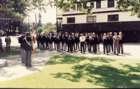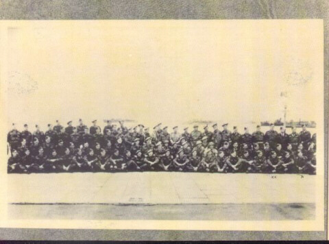 A group photo of all officers of 2nd Canadian Infantry Division who proceeded for Operation Jubilee (Dieppe) Docks at Portsmouth "Beatrix & Invicta" and other navy vessels in background. With a magnifying glass Les England and Buck Buchanan can be seen in the group.