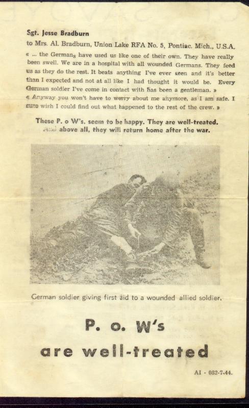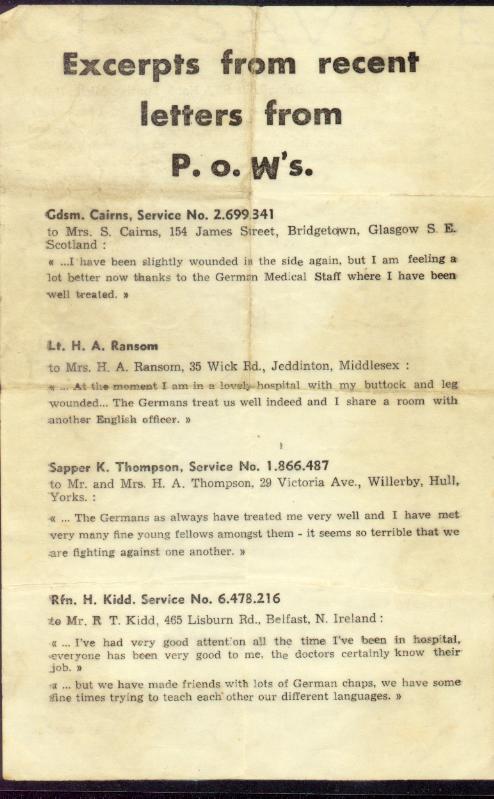 "Excerpts from recent letters from P.O.W.s" the Germans left laying around in a little town that we took over from them, to try to convince us to become prisoners of war rather than fighting on. The man in the picture being attended to by the German soldier was a man from Swan River by the name of Dubreuil. My uncle was taken prisoner at the same time and remembered seeing it take place. They were in the Queen's Own Cameron Highlanders of Winnipeg. I have recently had them laminated in order to preserve them. These that I am sending you are copies that I had made from the originals.