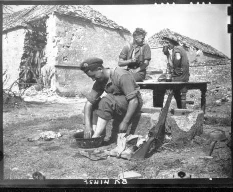 Personnel of the South Saskatchewan Regiment, Rocquancourt, France, 11 August 1944. (left to right): L/Cpl. M.H. Krushelinski, Pte. J.A. Balogh, L/Cpl. P. Kostyk.