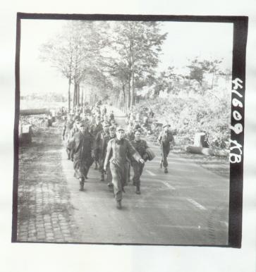 Group of German prisoners guarded by personnel of the South Saskatchewan Regiment, Hoogerheide, Netherlands, 15 Oct 1944.