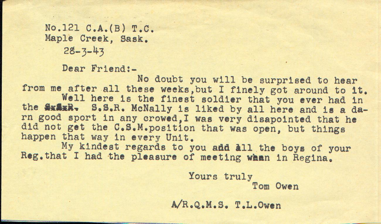Image 92 - Letter from No. 121 CA (B) T.C. Maple Creek, SK, dated 28Mar1943