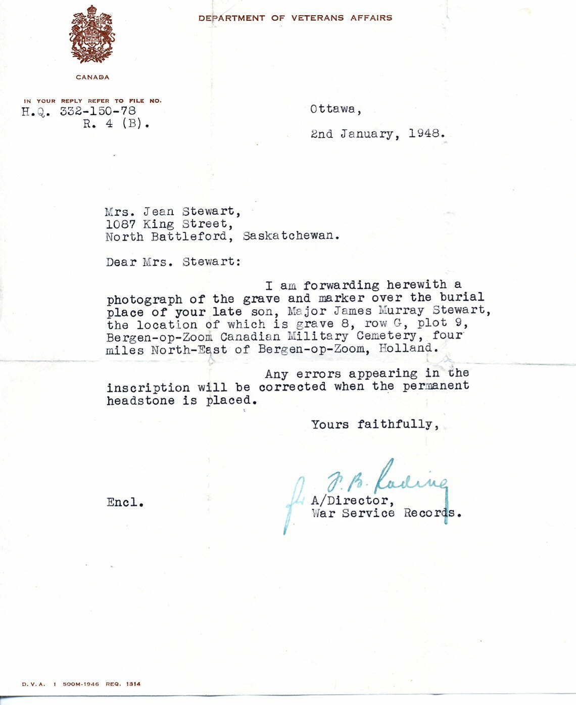 Received by Capt. J.M. Stewart while stationed at Algonquin Camp, Whitley, England. November 1943.