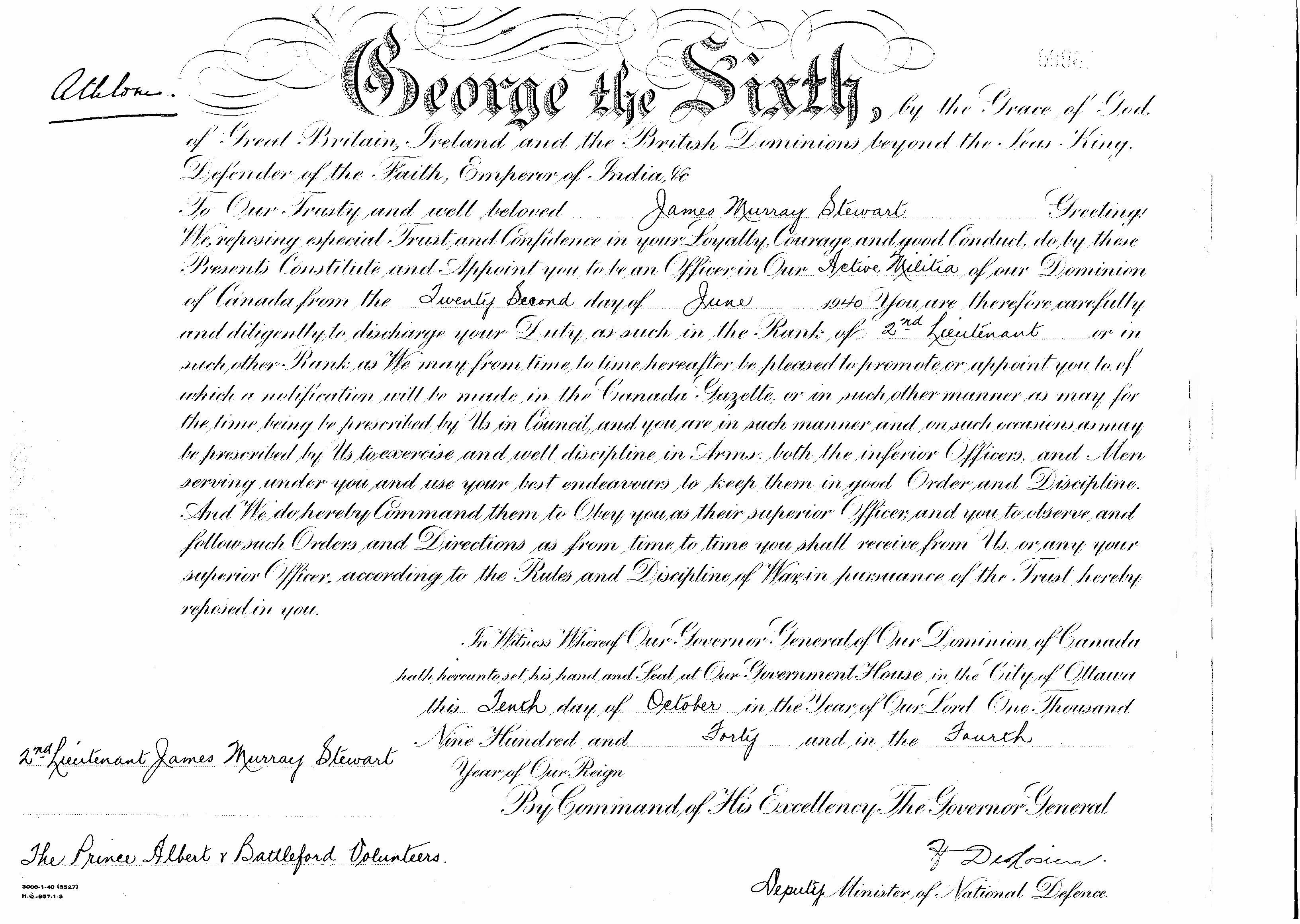 1. Certificate appointing J.M. Stewart a 2nd Lieutenant in the Active Militia