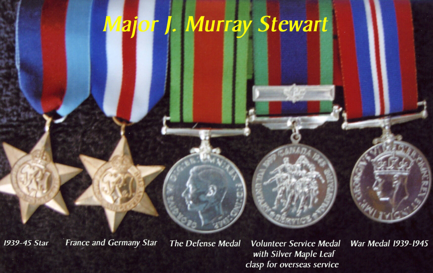 l - r: 1939-1945 Star, France and Germany Star, Defense Medal, Canadian Volunteer Service Medal with Maple