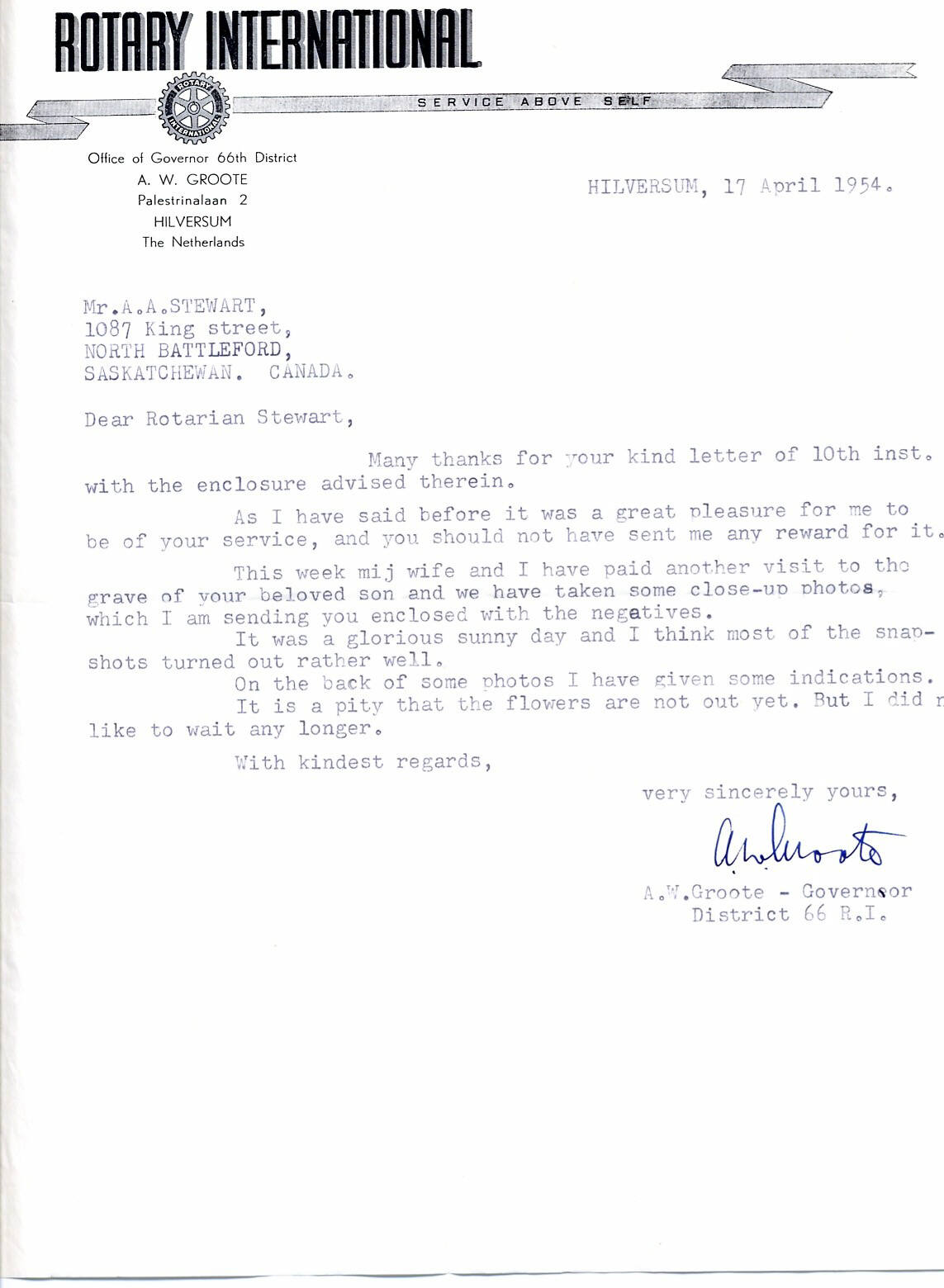 Letter from A.W. Groote re: grave site - 1954