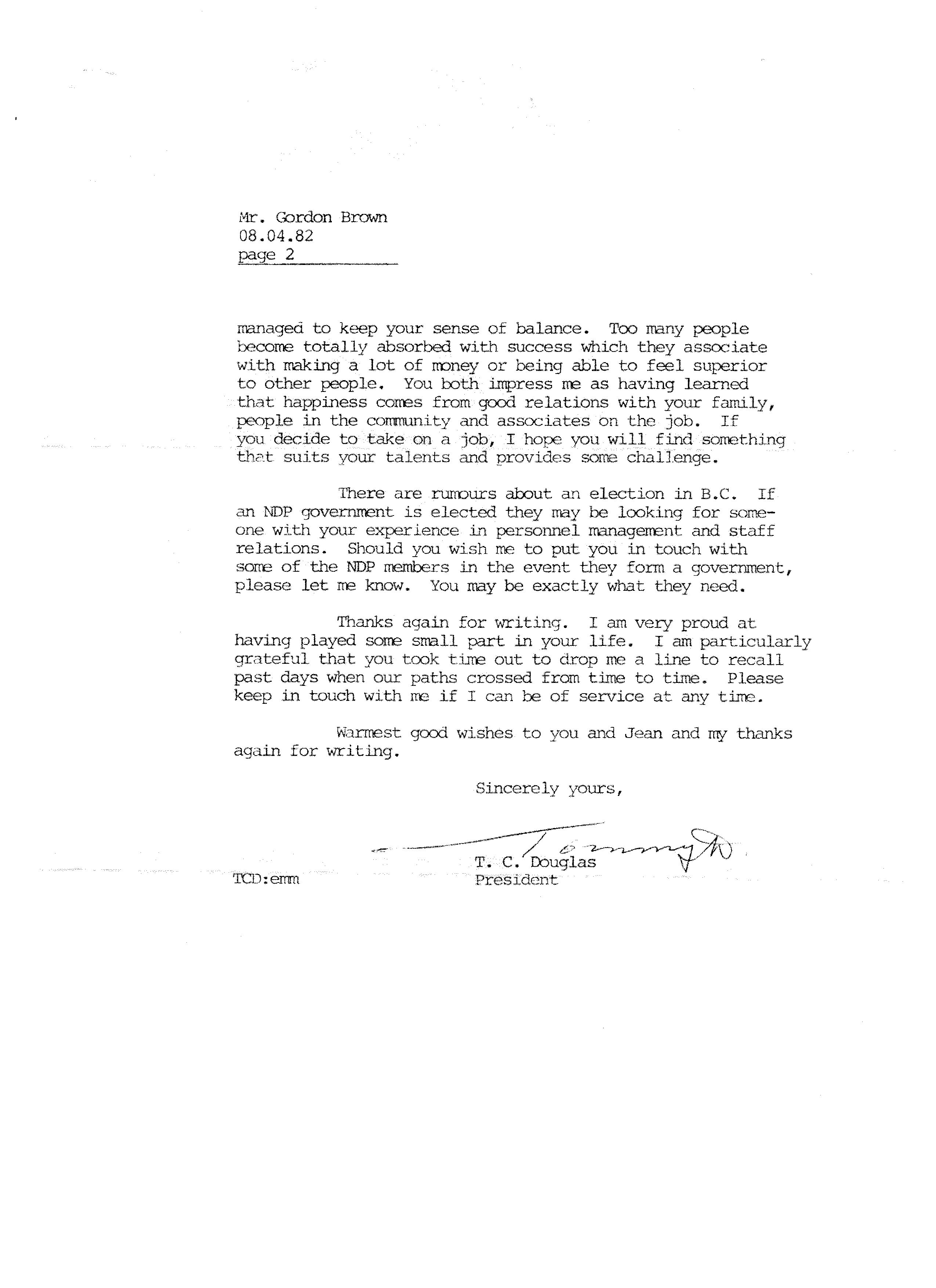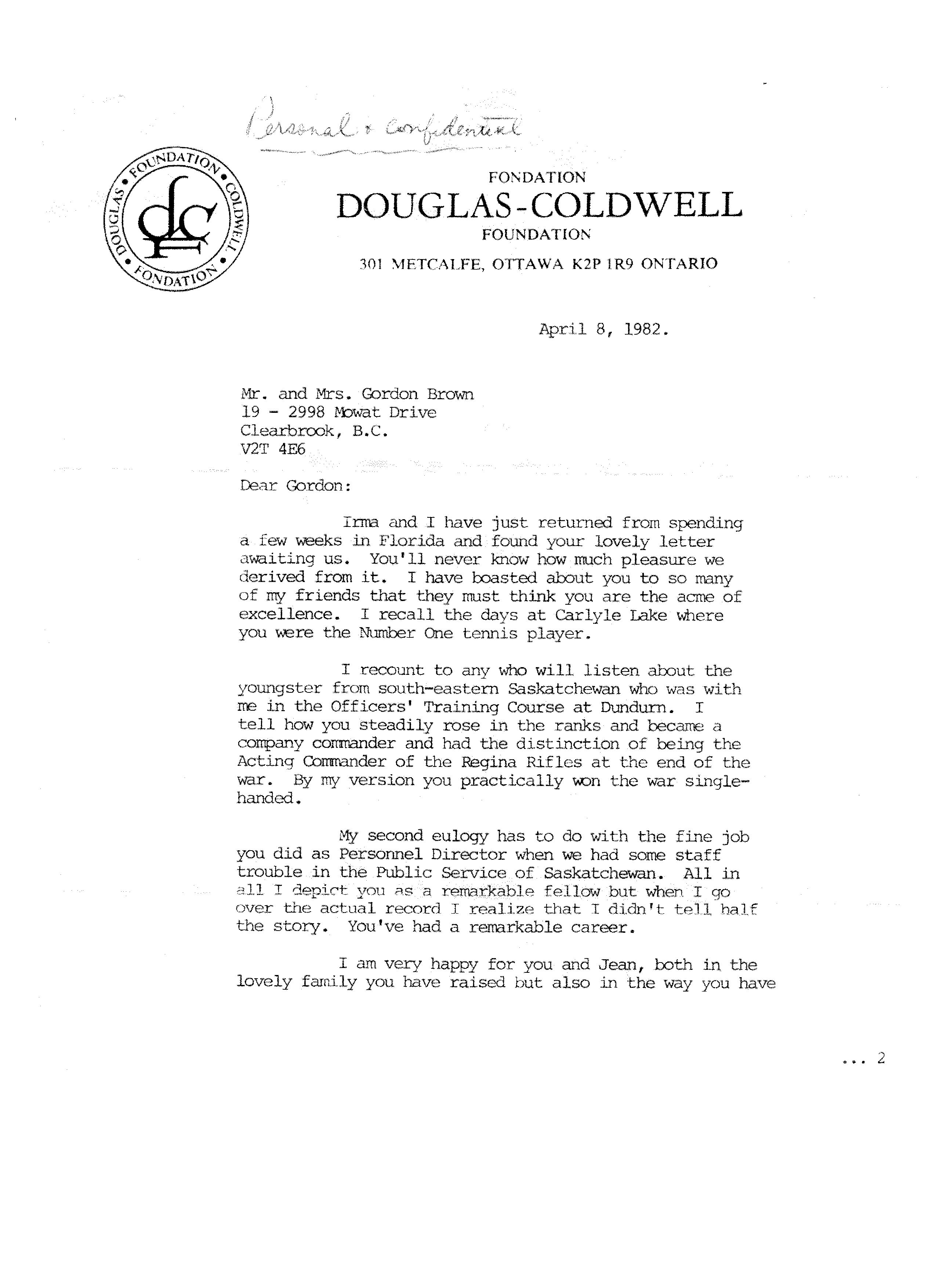 A letter from Tommy Douglas to DG Brown, 18 Apr 1982, which discusses their time in the military: