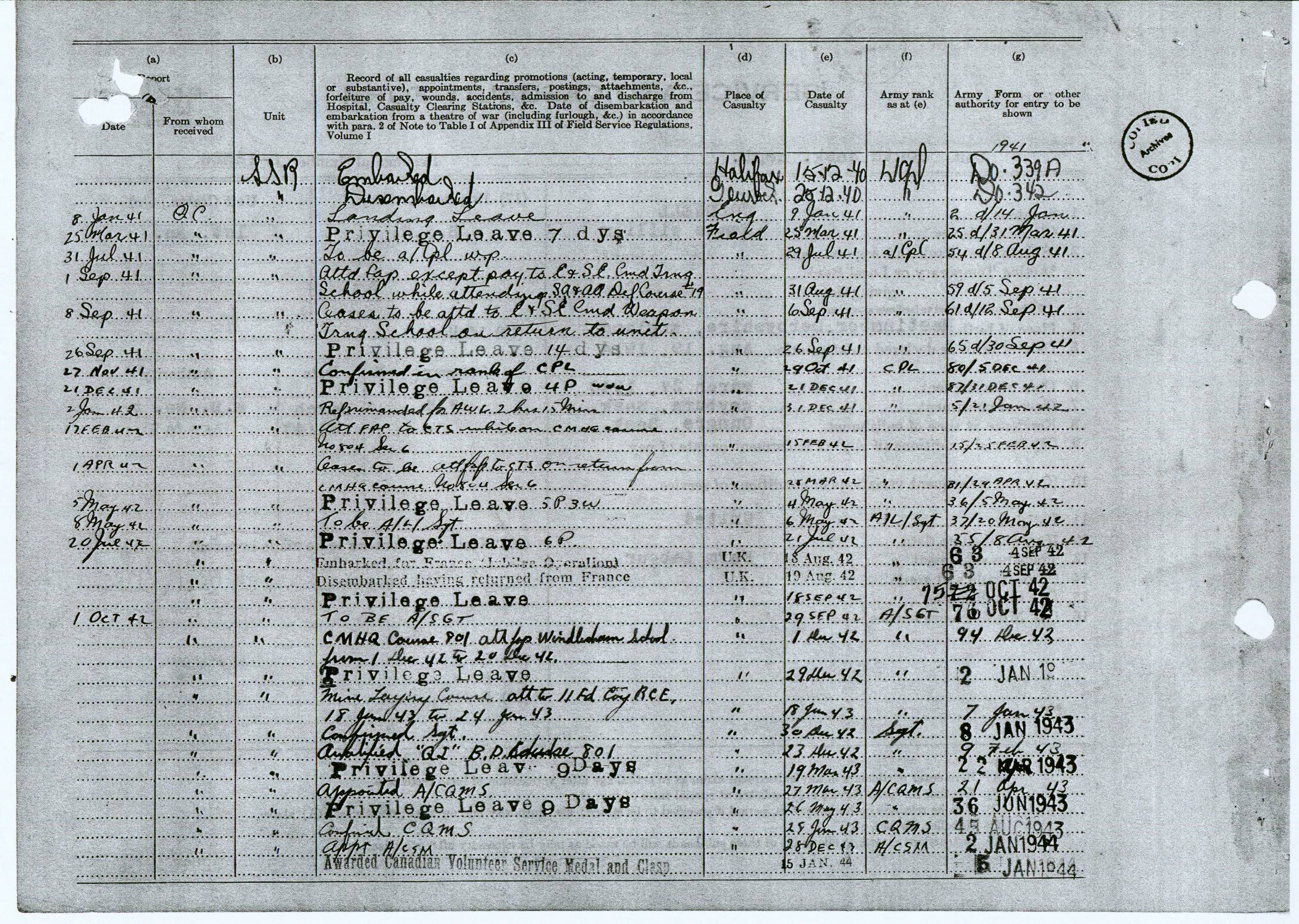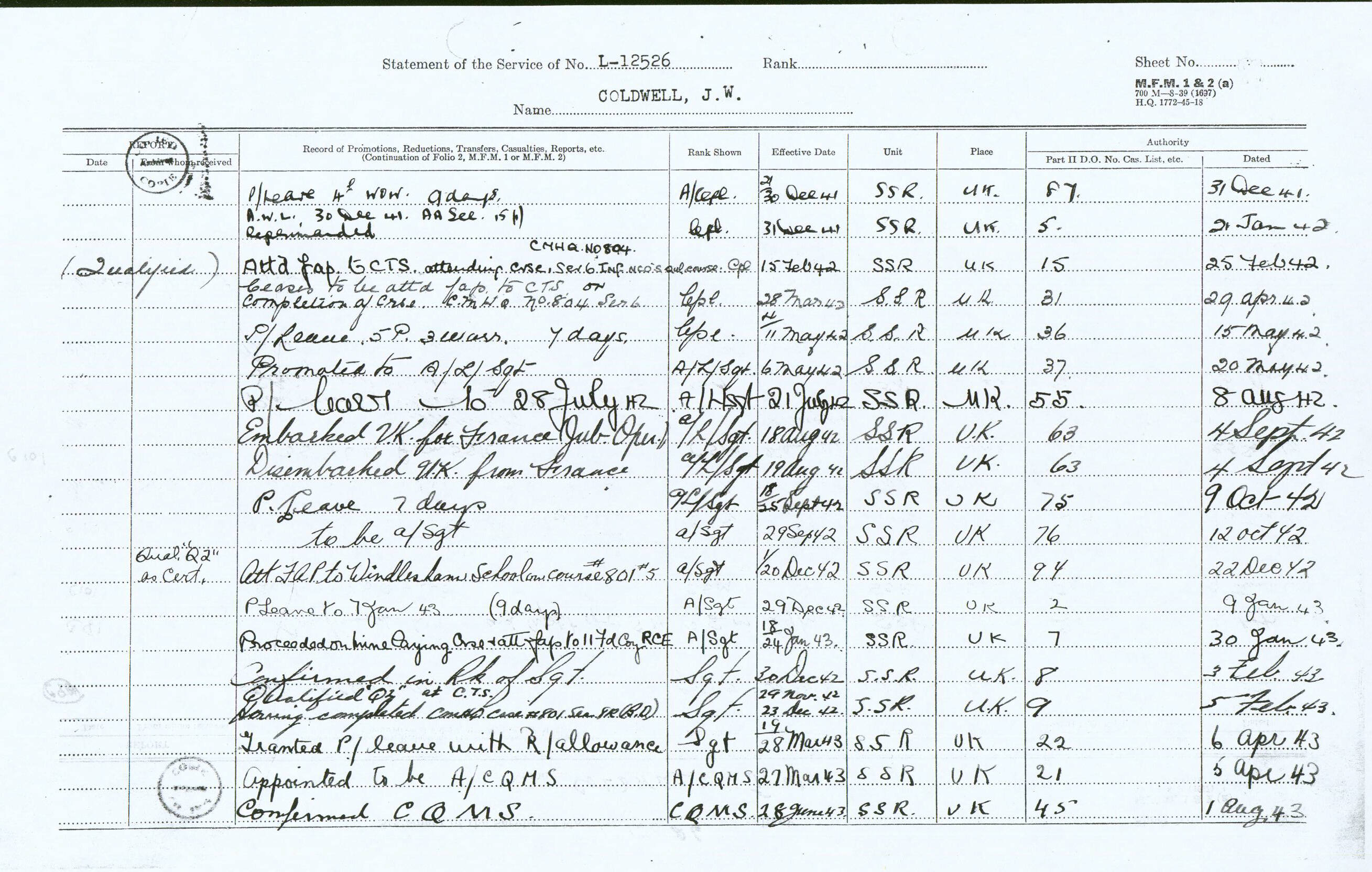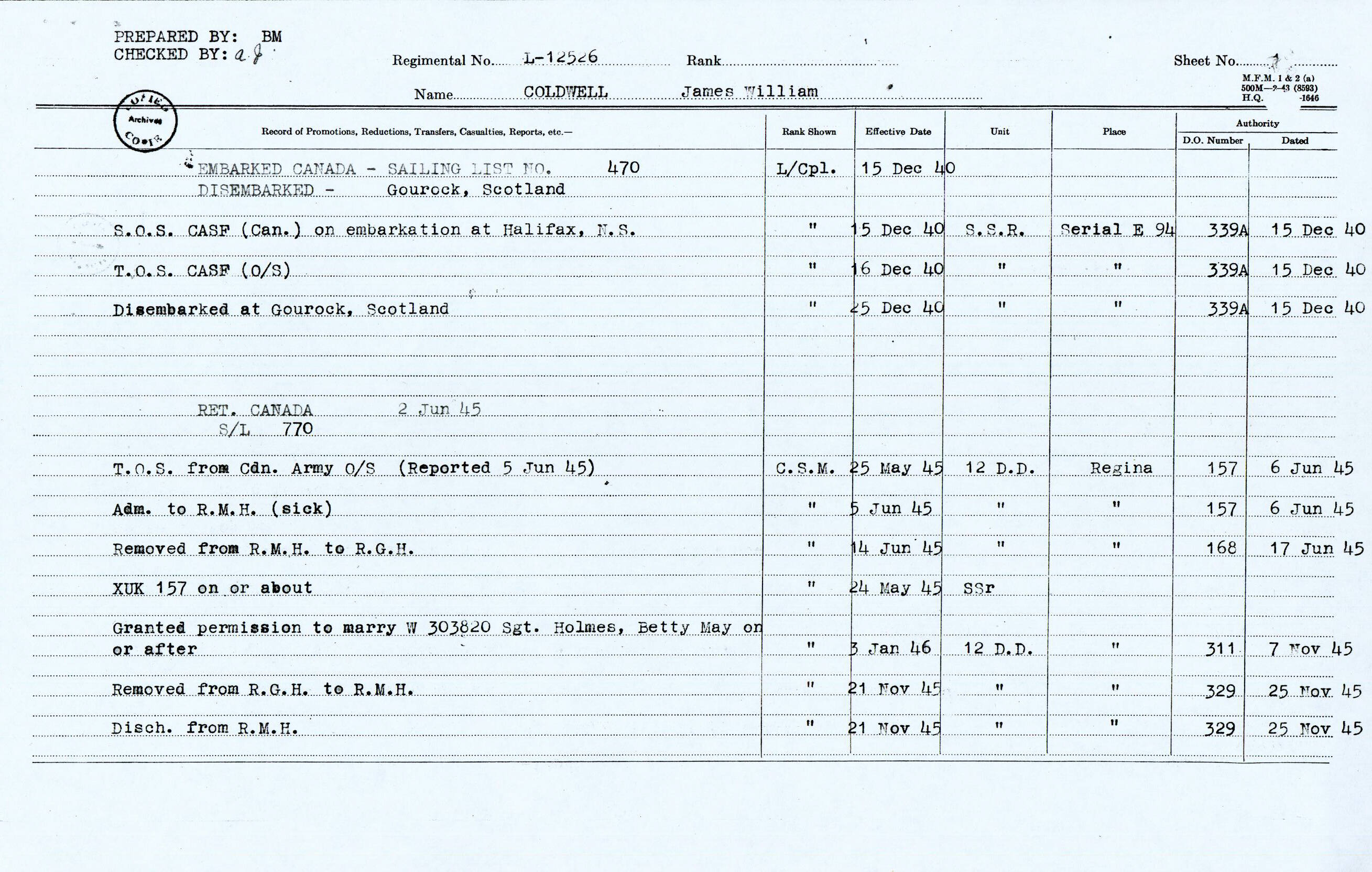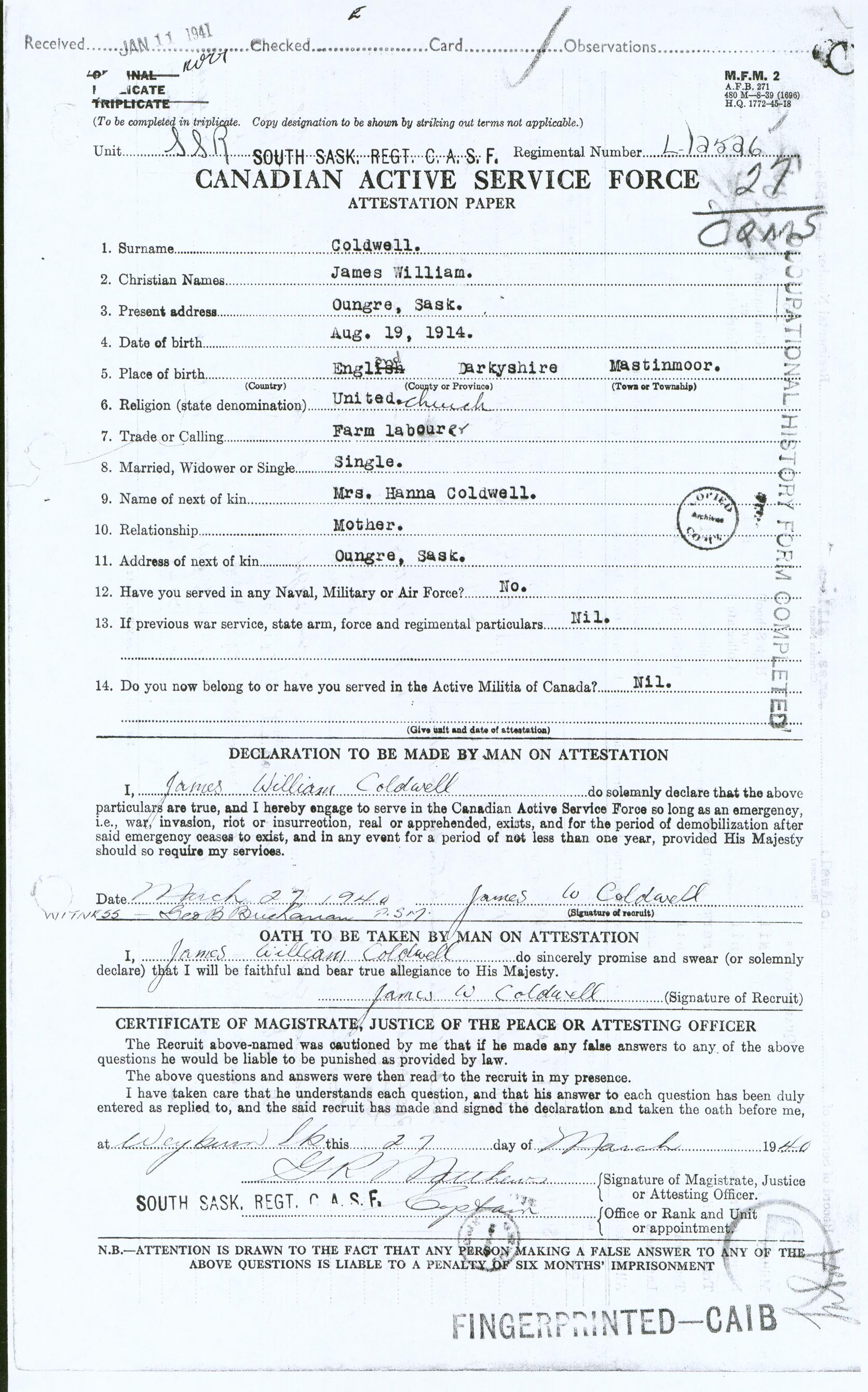Military Service Record - James William Coldwell