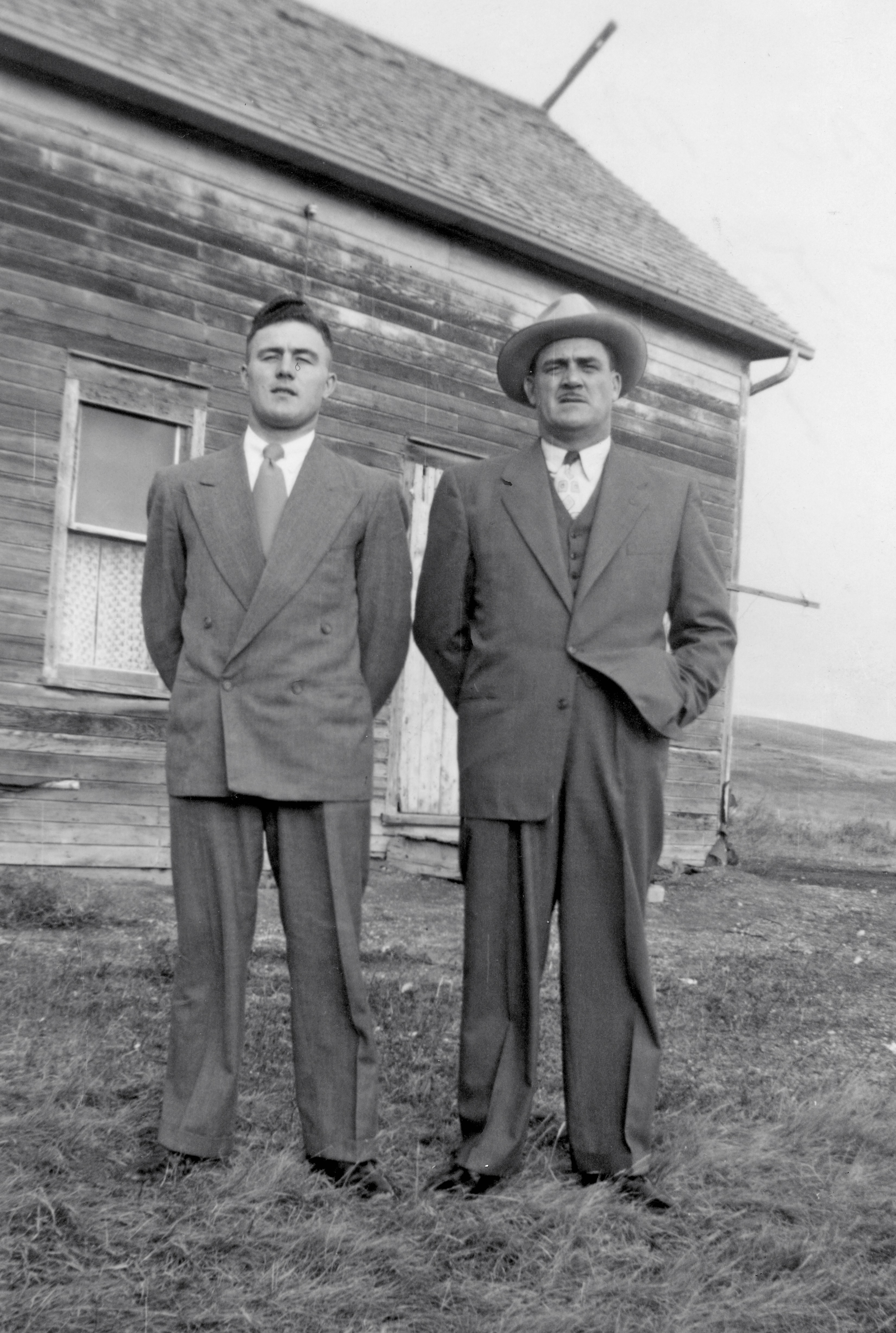 Alf Garvin and his son at the farm Alf received from the DVA in 1945. It is (was) two miles East of Craik. This photo is 1951. Alf Garvin's son was a recruit, home on leave, from the RCM Police training Depot in Regina.