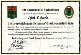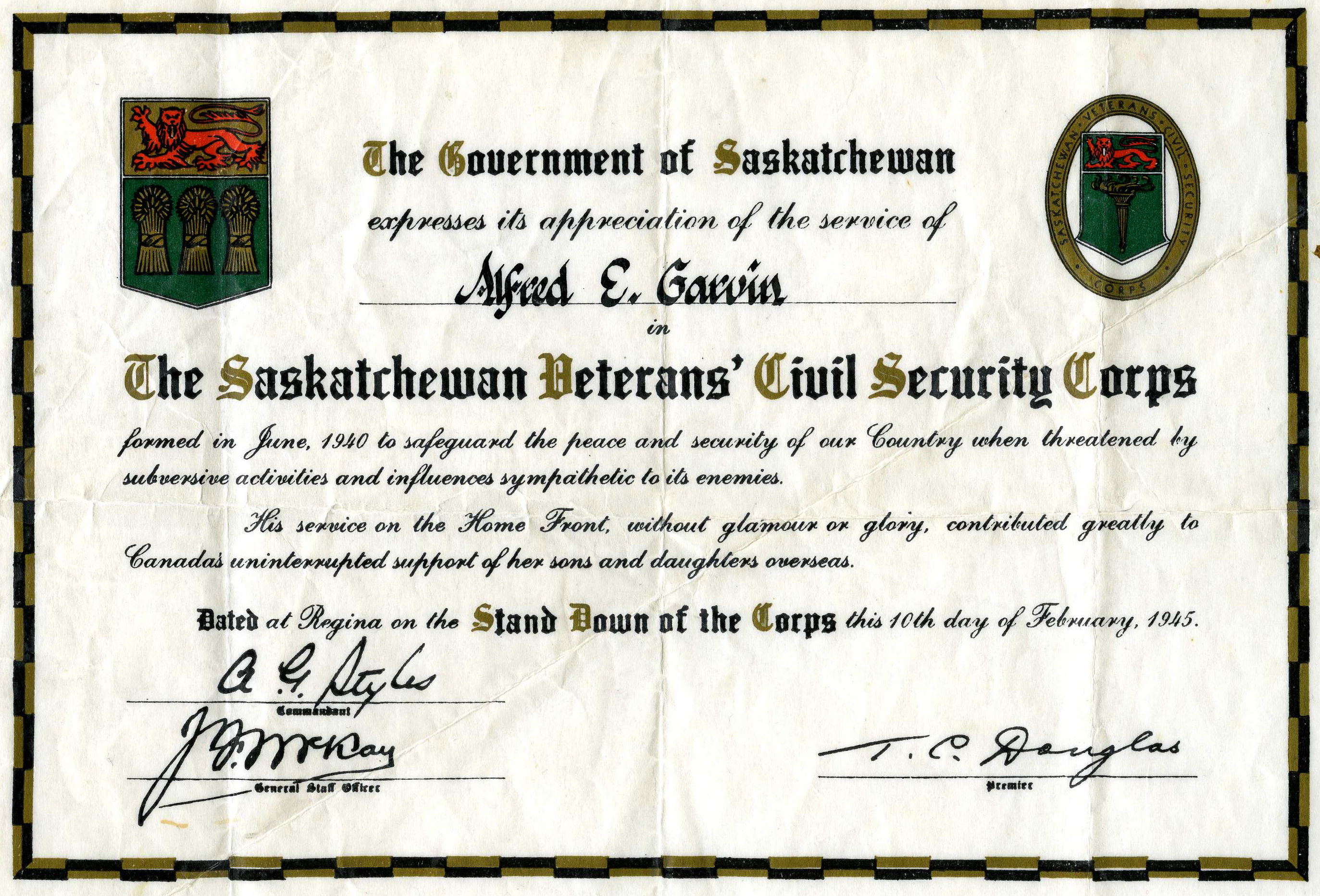This is the certificate and badge that Alf Garvin received personally from T.C.Douglas and Mr. Schumiatcher, a Regina Lawyer, on a visit they made to Craik in 1945. The badge that accompanies this certificate is brass and is designed to imitate the badge shown in the right upper corner of the certificate.
