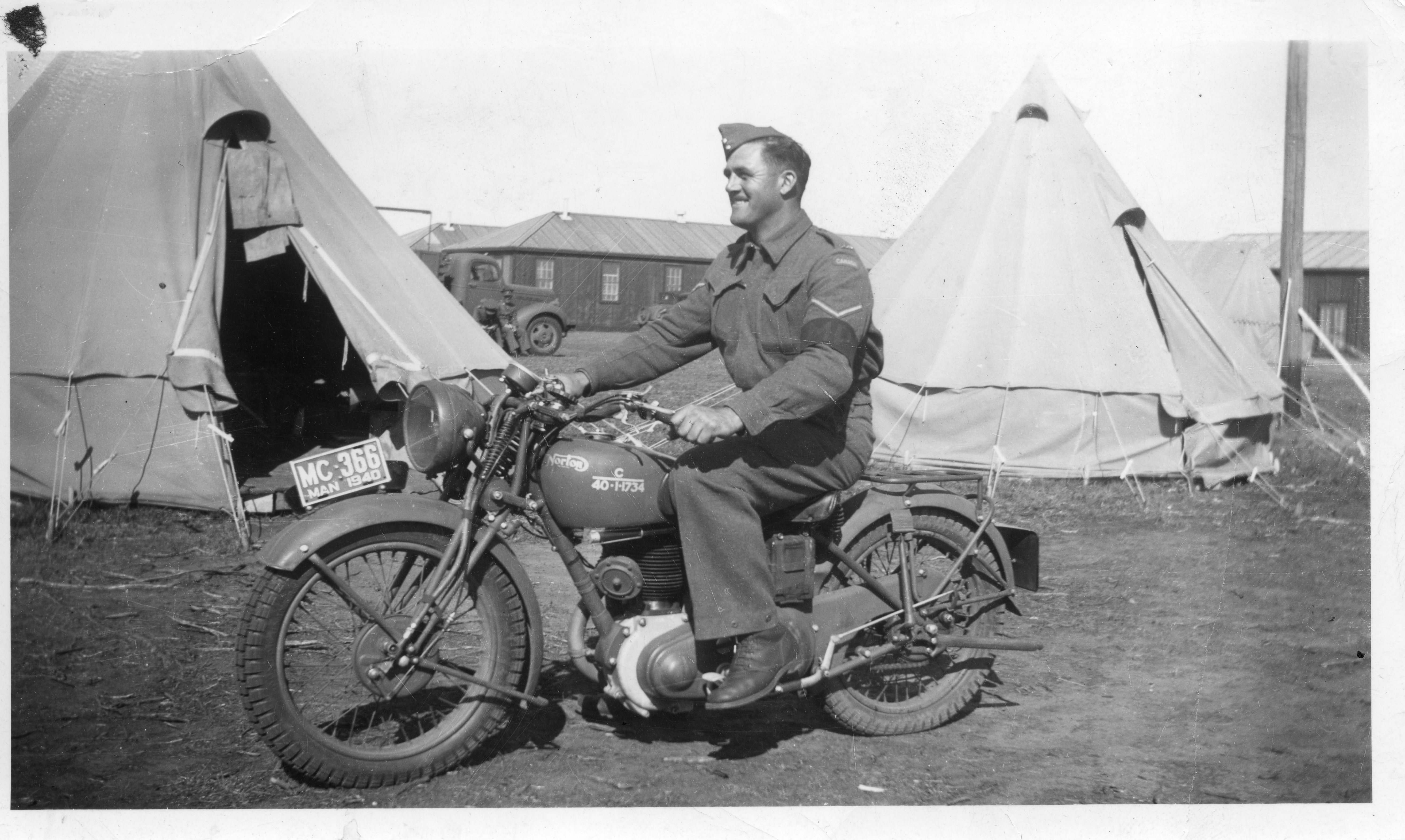 Alf joined the South Saskatchewan Regiment, on April 6, 1940. He went overseas, landing in Scotland on December 24, 1940. He was a motorcycle dispatch rider and a military policeman. He was, he once said, "an unofficial snooper" for the Regiment. He suffered a fracture of 1st and 3rd. L.0. (back) in a motorcycle accident in England and was hospitalized. His injuries handicapped his ability to perform military duties and he was re-boarded (shipped home), arriving in Canada on the 14th. of November 1941. He was medically discharged on the 23rd, December 1941, and so was his income. In years to follow he had two bouts of back surgery related to his overseas injury.