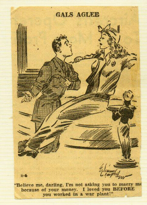 Gals Aglee newspaper cartoon - The benefits of working in a war plant!