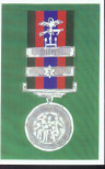A painting by David Devigne of Pessac/Bordeaux, France, of Canadian ribbon and Medal CVSM (Canadian Volunteer Service Medal) & Clasp - the clasp is a silver bar with small maple leaf, placed across the Ribbon, Dieppe clasp above.