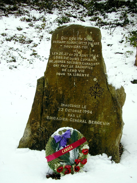 I enclose for you a recent photo (snow is very unusual here!) of the memorial erected in the forest to celebrate the memory of the Canadian soldiers fallen here in 1944.