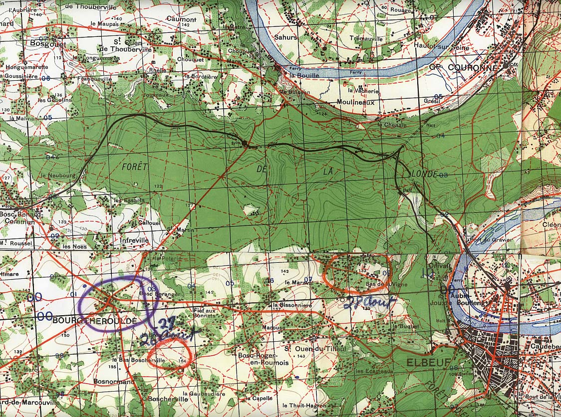 "On the morning of 27th August, the battalion embussed again on T.C.V.s for the beginning of a long push to the Seine River. They debussed at St. Martin on the edge of the Foret de La Londe which was an eight-mile stretch of thick woodland situated in a large bend of the Seine River, a few miles from Rouen. It was soon established that the forest was defended by high-grade German troops. They fought a bitter battle from tree to tree throughout the forest."