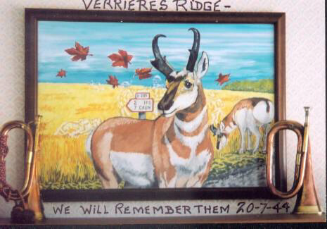 Photo of watercolour painting of Verrieres Ridge by David Devigne of Pessac/Bordeaux, France. This is the actual area where "D" Company objective was on 20Jul1944. "I supplied him with a photo of the same area, and also Battle Map of the day with all the reference point." - PT Maule. Photo of painting on wall with horns belonging to PT Maule.