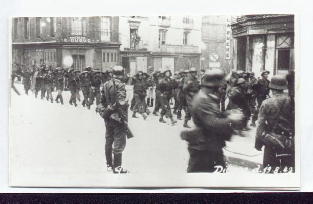 4 German soldiers with prisoners marching - Dieppe, 19 August 1942