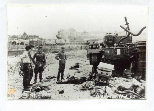 8 German officer, soldier with allied tank and wounded lying on ground, Dieppe, 19 August 1942