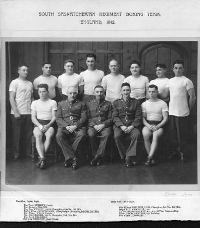 South Saskatchewan Regiment Boxing Team, England, 1942. Back Row, left to right: Pte. Billy Knight, Coach; Pte. Johnny Frazze; Pte. Don Knight, 160 lb. Champion, 6th Cdn. Inf. Bde.; L/Cpl. Frank Nieviadomy, Heavyweight Champion, 6th Cdn. Inf. Bde.; Pte. Kelly Webb, Trainer; Pte. Stu Leader, 160 lb. Champion, 2nd Cdn. Div.; Pte. Paul Delorme; Cpl. Joe Gregory, Head Coach.
