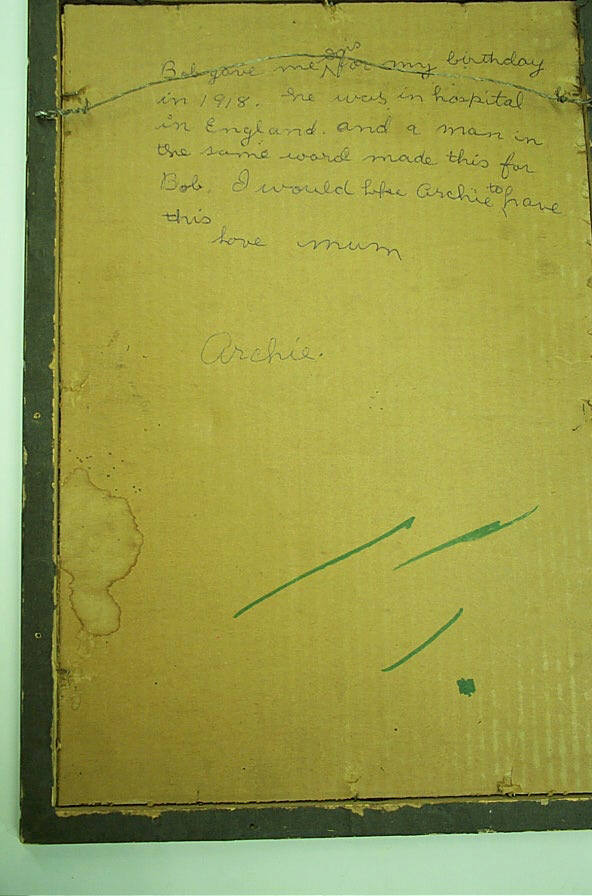 Bob gave me for me, Onis, for my birthday in 1918. He was in hospital in England and a man in the same ward made this for Bob. I would like Archie to have this. Love Mum. First World War. 1918.
