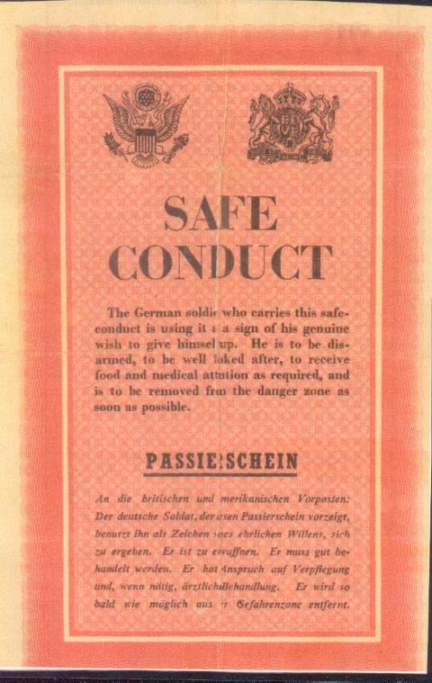 The Safe Conduct Sheet was dropped at Falaise telling the Germans what to do when coming in as prisoners after the Falaise Gap was closed. I was on watch at about midnight when they came fluttering down.