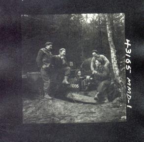 L. to R.: Privates Davey Holmes, Jack Rattray, Pete Dukart, Alex Hutchison and Fred Mohl of 'D' Company, South Saskatchewan Regiment by their carrier. Mook, Netherlands, 30 Nov. 1944.